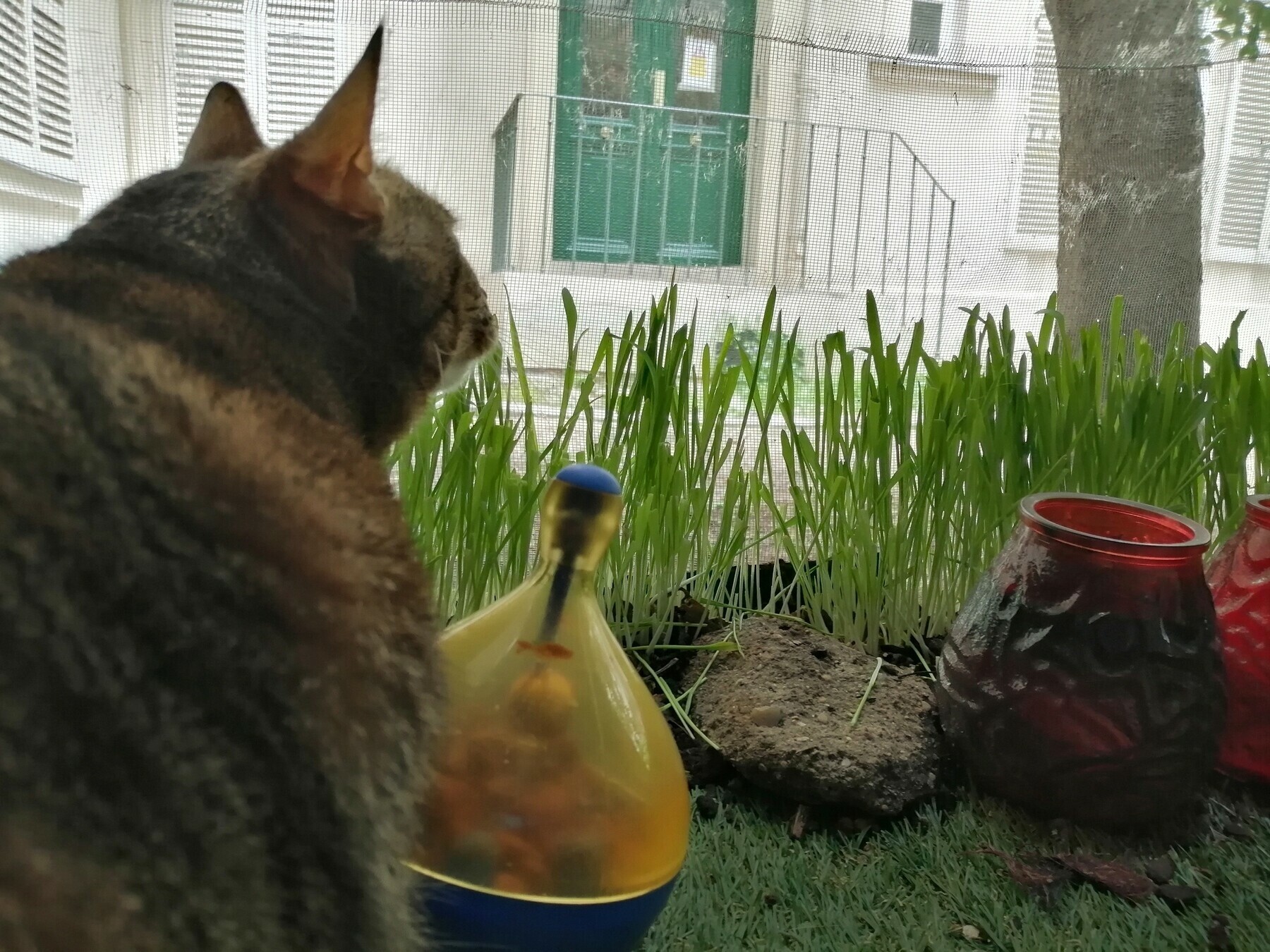 She’s hunting a bird in the tree, hiding behind the cat grass