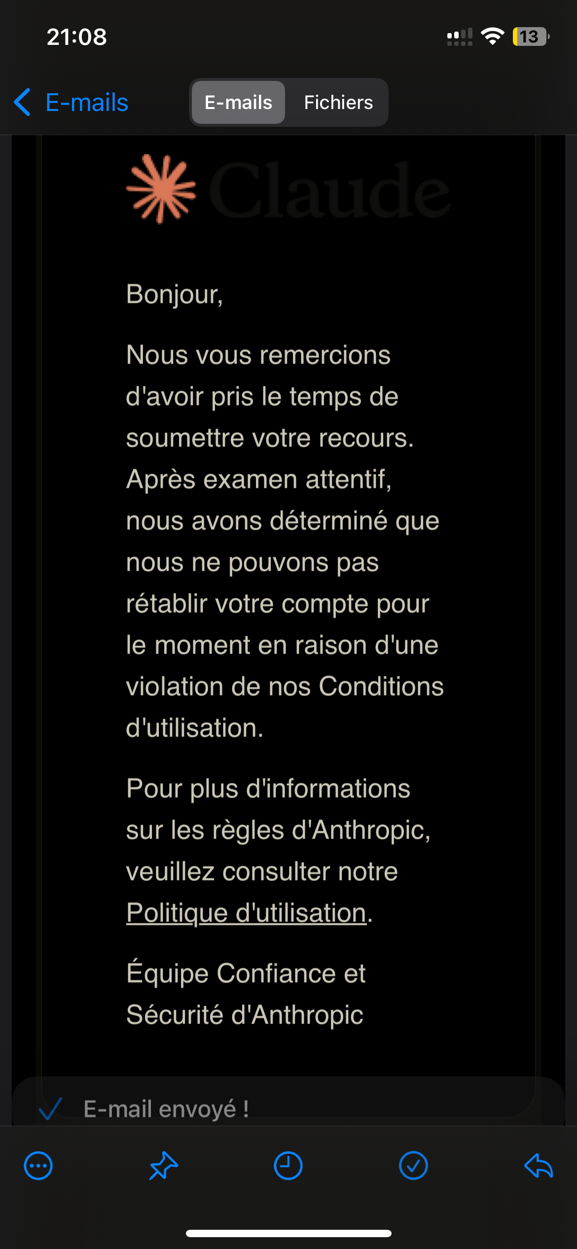 Anthropic, the maker of the AI crawler that is very much eating gigabytes of shit from my tarpit daily, has determined my account was violating something but really won’t clarify. Would it be because they figured out their bot is eating shit from my tarpit ? Obviously no just vibes
