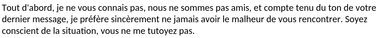 Because I did France too long, I took a reasonable response to somebody who did the tutoyé (the person who is responsible for pulling out my fibre cable)